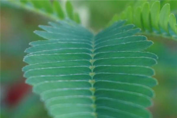 Mimosa grow very delicate and weak, oval green leaves, long like feathers, there is a stem in the middle, a small piece of young leaves repeatedly stacked, showing the shape of palm arrangement.